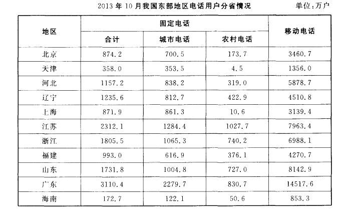 解析 读表格可知,2013年10月,上海城市电话用户数多于天津,排除A项;福建城市电话用户数多于海南,排除B项;广东城市电话用户数多于江苏,排除D项。