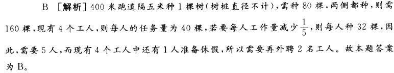 问题 朝阳公园拟定在一个400米的环形跑道两侧每隔五米种植1棵香樟树(内外环周长差以及树桩直径长度忽略不计),并把这项植树任务平均分配给公园的4个工人。但1个工人正准备休假,为了使该工人正常休假,且其他工人的工作量减少1/5,则还需要外聘工人几个?()