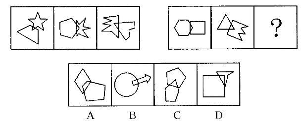 解析 第一组图形中,两个图形相交的部分都为三角形,且两图形边数和均为14。第二组图形中,前两幅图形的相交部分也均为三角形,两图形边数和均为10。据此规律,C项当选。
