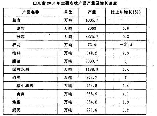 解析 C [解析]A项,2007年和2009年粮食总产量增长量均为55. 8万吨,A项错误。B项,2010年山东省无公害农产品基地面积比辣色食品基地面积多(1555817) 817 100%≈90. 33%,已超过了 90%,并非“将近”,B项错误。C项,从表格可知,2010年山东省主要牧产品增长率均为正值,故其产量约较上一年有所提高,C项说法正确。D项,2010年,山东省渔业增加值增长量为521. 4(1+4. 9%) 4. 9%≈24. 4(亿元),农林牧渔服务业增加值增长量为132. 5 (1 + 9. 9%)9. 9%≈11. 9(亿元),前者为后者的两倍多,D项错误。本题正确答案为C。
