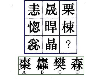 解析 D [解析]第一列汉字中都含有“心”,第二列汉字中都含有“日”,第三列汉字中都含 有"木”,且各列所含此中心字个数分别为1、2、3个,各行笔画依次分别为10、11、12画。无论 中心字个数还是笔画数,每列之间都成等差数列。由此可知问号处汉字必是一个12笔画且含 有3个“木”的汉字。故选D。