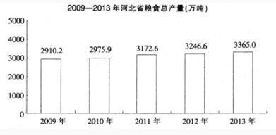 根据以下资料,回答126-130题。 2013年河北省粮食播种面积631.6万公顷,比上年增加1.4万公顷;总产量3365.0万吨,增长3.6%。其中...