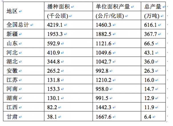 2014年全国棉花播放面积4219.1千公顷,比2013年减少2.9%。棉花总产量616.1万吨,比2013年减产2.2%。 2014年棉花产量前十位...