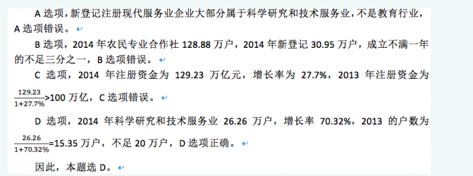 选项 A. 2014年新登记注册现代服务业企业大部门属于教育行业 B. 2014年末超过三分之一的农民专业合作社成立不满一年 C. 2013年全国实有各类市场主体注册资本(金)不足100万亿元 D. 2013年新登记注册科学研究和技术服务业企业不到20万户
