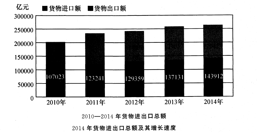 问题 指标 金额(亿元) 比上年增长(%) 货物进出口总额 货物出口额 其中:一般贸易 264334 143912 73944 2.3 4.9 9.6 加工贸易 其中:机电产品 高新技术产品 货物进口额 其中:一般贸易 加工贸易 其中:机电产品 高新技术产品 进出口差额(出口减进口) 54320 80527 40570 120423 68162 32211 52509 33876 23489 1.8 2.6 -1.0 -0.6 -1.0 4.5 0.7 -2.2 — 与2010年相比,2014年货物进出口总额增长约()。