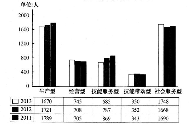 解析 从材料容易看出,2013年A区现有镇级单位10个,村民委员会124个,全区农村实用人才总数5198人,故所求(个),A项错误;由材料可得,2012年区农村实用人才总数5236人,而2013年女性人才934人,占比较上年提高3.7个百分点,达到18.0%。故2012年男性人才占比为。因此2012年男性人才人数约为(人),B项错误;由表格可看出从2011 — 2013年生产型和技能服务型人才数量逐年上升,C项正确;由表格容易得出每年人数最少的均是技能带动型,而非技能服务型,D项错误。故本题正确答案为C。