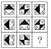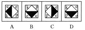 解析 九宫格中的每个图形,都是由中间的菱形和外围的四个带字母的小三角形组成,外面小三角形呈现的变化规律是每一行三个图形依次按照顺时针方向移动一个格子,据此规律,可以排除A、B两项。再看其他规律,菱形图案可通过连接对角线分为四个部分,分别为左上、右上、左下、右下。观察菱形中四个部分的变化规律可知,第一行中第一个、第二个、第三个菱形左上均为黑。可得公式①黑+黑=黑,同理可得公式②黑+白=白,③白+白=黑,④白+黑=白。此四个公式在第二行中也成立。第三行应遵循同样的规律。可推知“?”处图形中的菱形的左下、右下部分应为黑,排除C项。故本题答案应选D项。