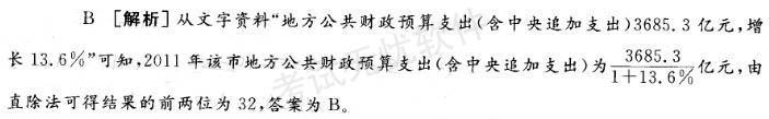 问题 2012年某市完成地方公共财政预算收入3314.9亿元,比上年增长10.3%。其中,实现增值税和营业税314亿元和1152.7亿元,分别增长32.1%和7.6%;实现企业所得税和个人所得税752.5亿元和281.5亿元,分别增长10.1%和3.1%。地方公共财政预算支出(含中央追加支出)3685.3亿元,增长13.6%。其中,用于文化体育与传媒、交通运输、教育、社会保障和就业、农林水事务的支出分别增长61.7%、22.4%、20.9%、19.2%和18.9%。 2011年该市地方公共财政预算支出(含中央追加支出)约为()。