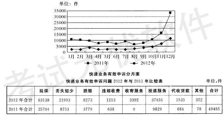 解析 读图可知,2011年10月、11月、12月快递业务有效申诉问题量明显高于其他月份,因此,2011年各季度中,快递业务有效申诉问题量最多的是第四季度,故本题应选D。