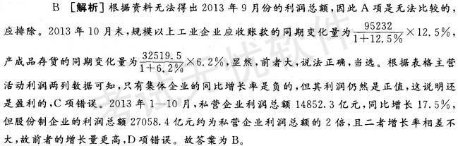 选项 A. 2013年10月,规模以上工业企业的利润总额低于2013年9月的利润总额 B. 2013年10月末,规模以上工业企业应收账款的同期变化量高于产成品存货的同期变化量 C. 2013年1—10月,规模以上工业企业主营活动利润中只有集体企业是亏损的 D. 2013年1—10月,利润总额同比增长量最多的是私营企业