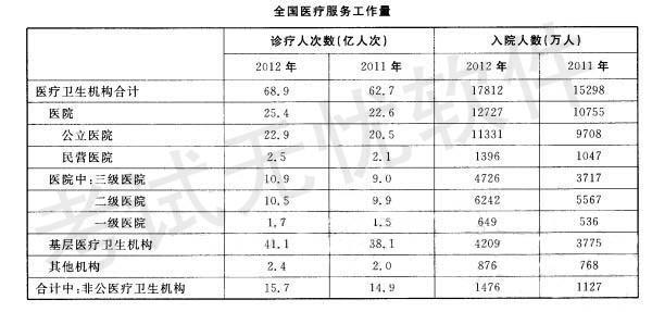 解析 根据表格中数据,2012年全国医疗卫生机构诊疗人次比2011年增长了因此,本题答案为A选项。