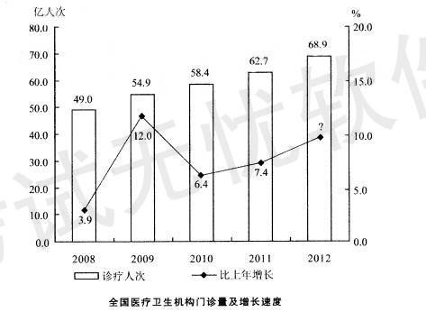 2012年全国医疗卫生机构诊疗人次相比上年增长了( )。A. 9.9% B. 10. 8% C. 11.0% D. 11. 1%
