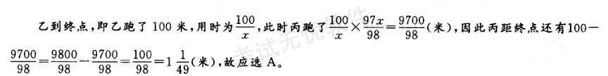 解析 甲、乙、丙三人进行百米赛跑,甲到终点时,乙离终点2米,丙离终点3米,说明在相同的时间内,乙跑了98米,而丙跑了97米,因为速度=路程/时间,所以乙丙的速度之比为98 : 97。设乙速度为x,则丙速度为97x/98。