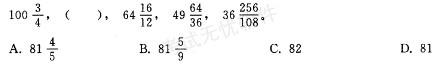 解析 分数数列,我们将其整数部分与分数部分分别考虑。 整数部分:100,(),64,49,36; 分数部分 3/4,(),16/12,64/36,256/108; 整数部分是平方数列,括号中的数字应该是81。 这是一个等比数列,因此括号里应该是(3/4)X(4/3)=1,因此答案是81 + 1=82。