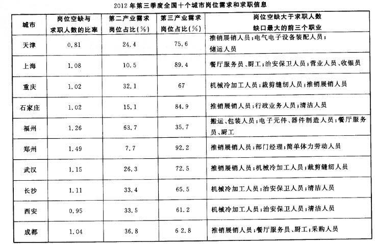 问题 2012年第三季度全国100个城市的公共就业服务机构市场中,用人单位通过公共就业服务机构招聘各类人员约643. 3万人,进入市场的求职者约610万人,岗位空缺与求职人数比率比上年同期上升了1%。上年同期这100个城市中,用人单位通过公共就业服务机构招聘各类人员约577. 9万人。 2012年第三季度,在所有求职人员中:失业人员所占比重为48.8%,其中,新成长失业青年占24. 2% (在新成长失业青年中应届高校毕业生占51.4%),就业转失业人员占13.4%,其他失业人员占11. 2%;外来务工人员的比重为41%,外来务工人员由本市农村人员和外埠人员组成,其中本市农村人员为95.2 万人。 2012年第三季度全国十个城市中,岗位空缺大于求职人数缺口最大的前三个职业,在半数以上城市中出现过的是( )。