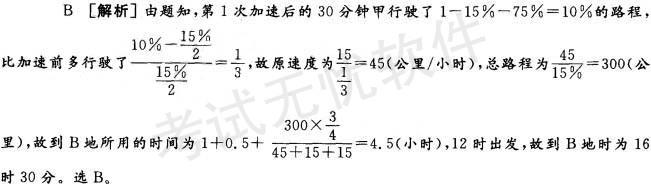 问题 中午12点,甲驾驶汽车从A地到B地办事,行驶1小时,走了总路程的15%。此后甲的速度增加了15公里/小时,又行驶了30分钟后,距离B地还有3/4的路程。此后甲的速度如果再增加15公里/小时,问几点能到B地?( )