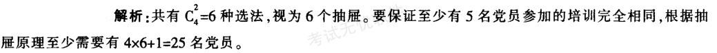 问题 某单位组织党员参加党史、党风廉政建设,科学发展观和业务能力四项培训,要求每名党员参加且只参加其中的两项。无论如何安排,都有至少5名党员参加的培训完全相同,问该单位至少有多少名党员?