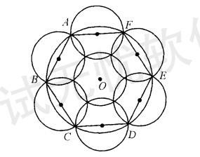 解析 由于每个小圓(喷头浇灌范围)的直径为10,所以每个小圓至多盖住圓心角为60度相 应的大圓(花坛)弧长,所以想盖住整个圓周,需要至少六个小圓,当且仅当这六个小圓以大圓的内接正六边形 各达中点为圓心,但此时大圓的圓心未被盖住,所以至少需要七个圓.下面构造的图纸证明,七个圓是可 以的: