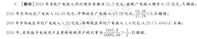 选项 A. 2010年,省级广电收入同比增长金额低于县级 B. 2010年,东部地区广电收入超过中部地区的3倍 C. 2009年,中部地区市均广电收入约是西部地区的3倍 D. 2010年,有线电视用户中有线数字电视用户的比重不足一半