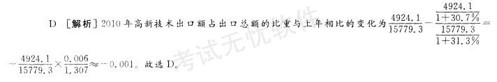 问题 2010年,我国进出口贸易总额为29727. 6亿美元,同比增长34. 7%。 2010年,我国机电产品出口 9334. 3亿美元,同比增加30.9%;高新技术产品出口 4924.1 亿美元,同比增长30. 7%。船舶、汽车零部件出口保持较快增长,其中船舶出口同比增长 44.5%,汽车零部件出口同比增长44. 1 %。 2010年,机电产品进口额达到6603. 1亿美元,同比增长34. 4%,高新技术产品进口额达 到4126.7亿美元,同比增长33. 2%。 2010年高新技术产品出口额占出口总额的比重与上年相比约( )。