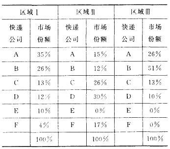 (2012年)某国有6家快递公同在全国范围内提供快递服务。为研究该国快递市场竞争状况,现将全国划分为三个区域.按业务收入计算了快递公司在各区域的市场分布状...