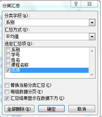 ,打开“分类汇总”对话框,设置分类字段为“系别”,汇总方式为“平均值”,汇总项为“成绩”,汇总结果显示在数据下方,单击“确定”按钮,如图4.10,工作表名不变,保存EXC.XLSX工作簿。