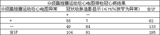 问题 Sketch用冠状动脉造影术与运动试验后的心电图改变对195个男性患者作检查,结果如表所示: 据此,该试验的正确诊断指数为