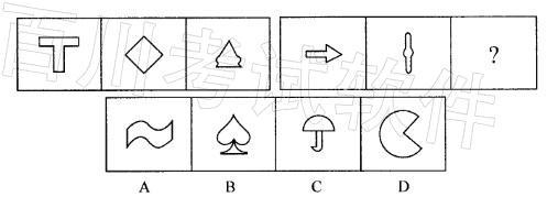 解析 在第一组图形中,第一个图形关于竖轴对称,第二个图既关于横轴对称又关于竖轴对称,第三个图形,再次关于竖轴对称,根据此规律观测第二组图形可知,第一个为关于横轴对称,第二个既关于横轴对称,又关于竖轴对称,那么第三个,即“? ”处所填图形应为关于横轴对称图形,只有D项符合此规律。