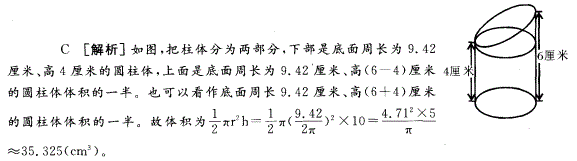 问题 圆柱底面周长为9. 42厘米,斜着截去一段后,剩余体积是()立方厘米。 (π取3, 14) A. 12.5 B. 15.725 C. 35. 325 D. 63. 15