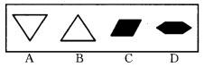 解析 前一组图形中,第一个图形去掉中间黑色部分,上下部分相接得到第二个图形;在第二个图形基础上去掉上半部分,可得到第三个图形。后一组图形依此规律,最后得到的应是一个倒着的白色三角形。故本题答案为A。