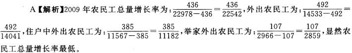 问题 2009年度全国“农民工总量”为22978万人,比上年增加436万人。其中“外出农民工”14533万人,比上年增加492万人。在外出农民工中,“住户中外出农民工"11567万人,比上年增加385万人;“举家外出农民工”2966万人,比上年增加107万人。 从输出地看,2009年东部地区农民工10017万人,同比增长3. 1%,东部地区农民工占全国农民工总量的比重为43. 6%;中部地区农民工7146万人,同比增长0. 9%,中部地区农民工占全国农民工总量的31. 1%;西部地区农民工5815万人,同比增长1. 2%,西部地区农民工占全国农民工总量的25. 3%。 从输入地看,2009年在东部地区务工的外出农民工为9076万人,比上年减少888万人,下降8. 9%,占全国外出农民工人数的62. 5%,比上年降低8. 5个百分点;在中部地区务工的外出农民工为2477万人,比上年增加618万人,增长33. 2%,占全国外出农民工人数的17%,比上年提高3. 8个百分点;在西部地区务工的外出农民工为2940万人,比上年增加775万人,增长35.8%,占全国外出农民工人数的20.2%,比上年提高4.8个百分点。 从性别看,男性外出农民工占65. 1%,女性占34.9%。从年龄看,外出农民工以青壮年为主。其中,16 ~ 25 岁占 41.6%,26~ 30 岁占 20% ,31 ~ 40 岁占 22. 3% ,41 ~ 50 岁占 11. 9%,50岁以上的农民工占4. 2%,从婚姻状况看,已婚的外出农民工占56%,未婚的占41.5%,其他占2.5%。 在外出农民工中,文盲占1.1%,小学文化程度占10. 6%,初中文化程度占64.8%,高中文化程度占13. 1%,中专及以上文化程度占10.4%。高中及以上文化程度比重比上年提高1.7个百分点,占23.5%。分年龄组看,低年龄组中高学历比例要明显高于高年龄组,30岁以下各年龄组中,接受过高中及以上教育的比例均在26%以上,其中,21 ~25岁年龄组中接受过高中及以上教育的比例达到31. 1%。 2009年,外出农民工月平均收入为1417元,比上年增加77元,增长5.7%。外出农民工月均收入在600元以下的占2. 1%;600 ~ 800元的占5. 2%,800 ~ 1200元的占31. 5%, 1200 ~ 1600元的占33. 9%;1600 ~ 2400元的占19. 7%;2400元以上的农民工占7.6%。 与上年相比,2009年以下四项的增长率最低的是( )。 A. “农民工总量” B. “外出农民工” C.“住户中外出农民工” D. “举家外出农民工”