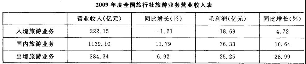 2009年度全国旅行社营业收入为1806. 53亿元,同比增长8.64%;毛利润总额为134.36 亿元,毛利率为7. 44%;净利润总额为11. 48亿...