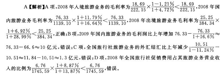 问题 2009年度全国旅行社营业收入为1806. 53亿元,同比增长8.64%;毛利润总额为134.36 亿元,毛利率为7. 44%;净利润总额为11. 48亿元,净利润率为0.64%。 2009年度全国旅行社的旅游业务营业收入为1745. 59亿元,同比增长8. 87%;旅游业务毛利润为120.27亿元,旅游业务毛利率为6. 89%;实缴税金为12.69亿元,同比增长12. 37%;外汇结汇10. 51亿美元,同比减少11.24%;全国促销费支出为6. 76亿元,同比增长13. 87%。 关于2009年全国旅行社营业状况,从资料中可以推出的结论是( )。A.三类旅游业务的毛利率均比上年有所增长 B.国内旅游业务的毛利润比上年增加近8亿元 C.全国旅行社旅游业务的外汇结汇比上年减少近1亿美元 D.全国旅行社促销费用占其旅游业务营业收人的比例比上年有所下降