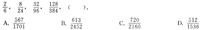解析 所有分数都可约分成且前一项的分子与分母之和为后一项的分子,由此可知下一项的分子应为128+384=512,分母应为512X3=1536。故本题答案为D。