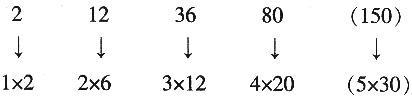 解析 第一个乘数1,2,3,4,(5)为自然数列, 第二个乘数2,6,12,20,(30)后一项减前一项得4,6,8,(10)。