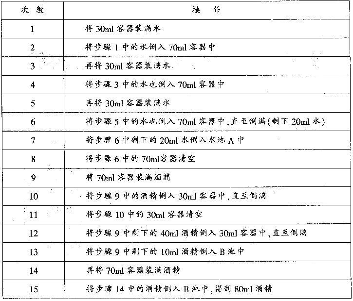 解析 本题是典型的操作问题,要求用1个70毫升和1个30毫升的容器反复操作得到20毫升和80毫升的溶液,最好列表格呈现操作的过程,注意倒进或倒出某个容器都算一次操作。 将30毫升的容器装满后倒入70毫升的容器中,反复3次可以得到20毫升的水:将70毫升的容器装满后倒入30毫升的容器中,再倒出,两次之后可以得到10毫升的酒精.再加上70毫升的酒精,得到80毫升的酒精.详细如下表所示: