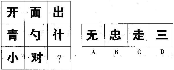 解析 第一行图形都由1部分组成,第二行图形都由2部分组成,第三行图形都由3部分组成,选项中只有D符合。