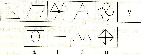 解析 考虑图形种类数。第一、三、五个图均由一种图形组成,第二、四个图均由两种图形组成,选项中只有A由两种图形组成。
