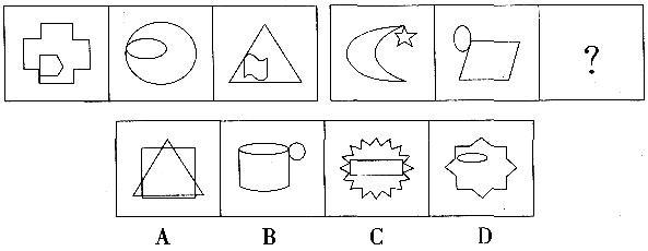 解析 第一组图形均有一个內部小图形与之相接,第二组图形均有一个外部小图形与之相接,答案为B。