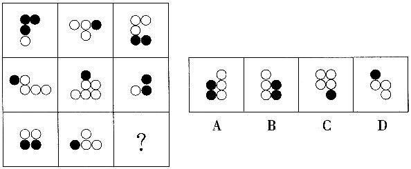 解析 沿着从左到右,从上到下的顺序,黑色球依次在白色球的上、右、下、左(顺时针)方向出现。只有D项的黑球在白球上方出现,选D。