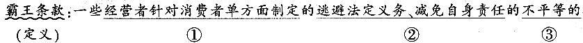解析 首先分析霸王条款的定义: 格式合同、通知、声明和店堂公告或者行业惯例等。 A项是一种影响社会管理秩序的强迫交易行为,不符合②;B项是一种对竞争对手的威胁行为,不符合①、②;C项不符合②、③;D项符合所有定义要点,是典型的霸王条款。故答案选D。