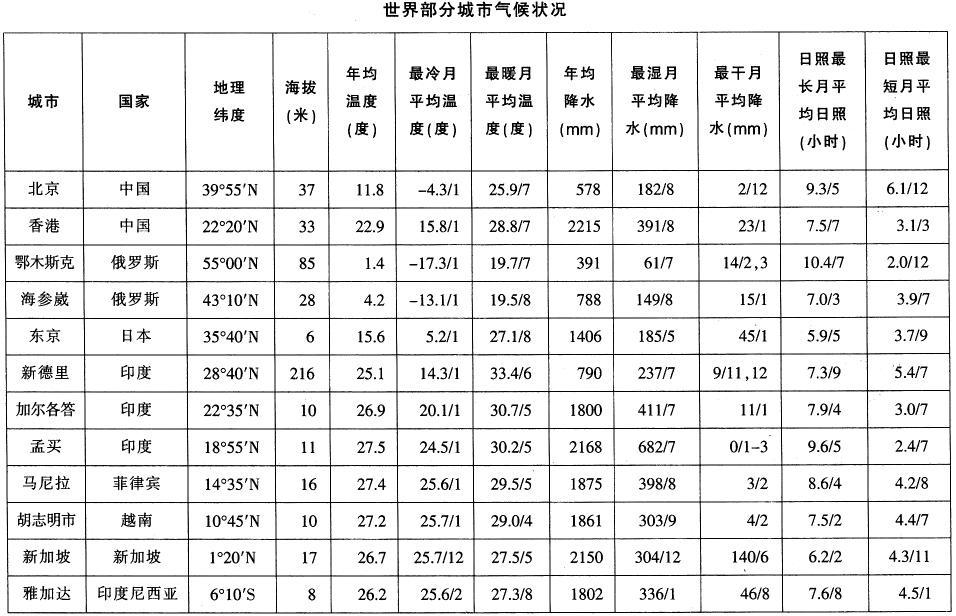 问题 [银行真题] 注:第6、7、9、10、11、12列中温度、降水和日照指标之后的数字表示特定的月份。 [材料要点]本题材料是一个具有一级标目的表格 标题:世界部分城市气候状况 单位:米、度、mm、小时 横标目:国家、地理纬度、海拔、平均温度、最冷月平均温度、最暖月平均温度、年平均降水等各气候状况指标 纵标目:北京、香港、鄂木斯克等十二个城市 [关注点]表格中数据繁多,要注意根据题干筛选数据,并注意各个指标的单位。 表中纬度第二高的城市.其日照最长月的平均日照时间约为日照最短月平均日照时间的几倍?() A.1.5倍 B.1.8倍 C.2.0倍 D.2.5倍