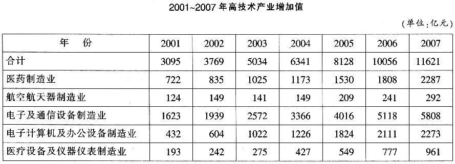 根据以下资料.回答6-10题:2001—2007年。高科技产业各行业中增加值年均增长率最大的是()。A.医药制造业B.电子及通信设...