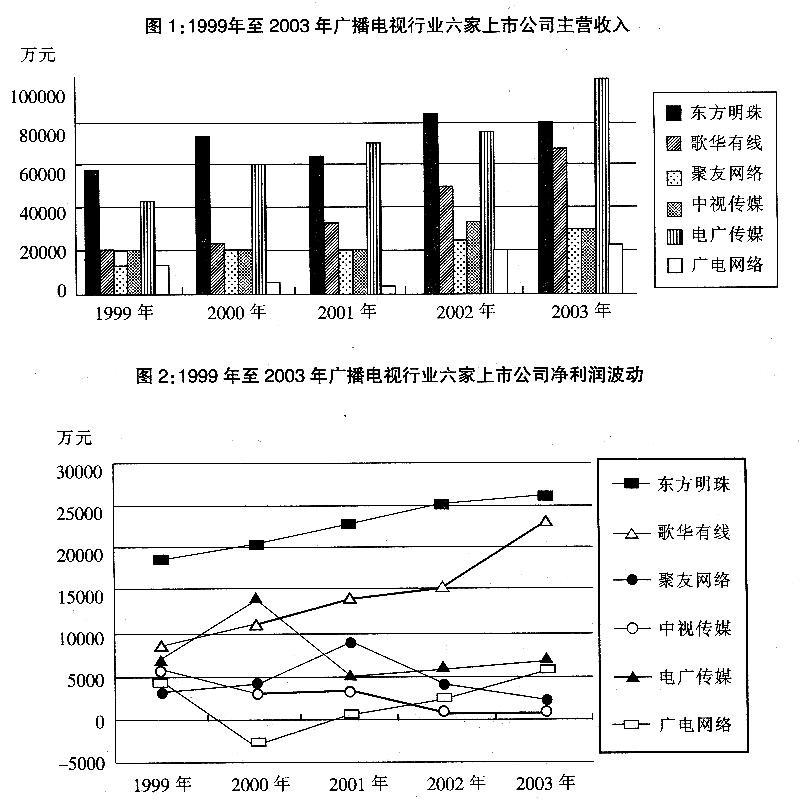 问题 根据以下资料.回答14-17题: [材料要点] 本题材料包括一个条形图和一个折线图。条形图介绍的是1999—2003年东方明珠、歌华有线、聚友网络、中视传媒、电广传媒、广电网络的主营收入,而折线图介绍的是1999—2003年东方明珠、歌华有线、聚友网络、中视传媒、电广传媒、广电网络的净利润。 [图1] 标题:1999年至2003年广播电视行业六家上市公司主营收入 单位:万元 横标目:年份(1999~2003年) 纵标目:主营收入 图例:从左到右依次为东方明珠、歌华有线、聚友网络、中视传媒、电广传媒、广电网络 [图2] 标题:1999年至2003年广播电视行业六家上市公司净利润波动 单位:亿美元 横标目:年份(1999~2003年) 纵标目:净利润 图例:实心小长方形——东方明珠 空心小三角形——歌华有线 实心小圆形——聚友网络 空心小圆形——中视传媒 实心小三角形——电广传媒 空心小长方形——广电网络 自2000年至2003年,广播电视行业六家上市公司中,净利润一直保持增长的是()。 A.东方明珠与聚友网络 B.中视传媒与电广传媒 C.歌华有线与东方明珠 D.广电网络与歌华有线