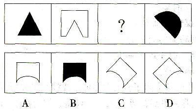 解析 题干中,第一个图形是第二个图形缺失的一部分,而且颜色不同.不用旋转,由此推断,C答案正确。