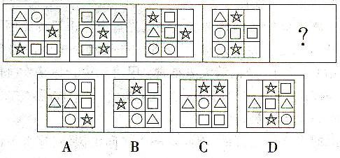 问题 图形推理。请按每道题的答题要求作答。 从所给的四个选项中,选择最合适的一个填入问号处,使之呈现一定的规律性。() A.选项A B.选项B C.选项C D.选项D