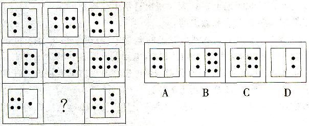 解析 左边格子的点数,第一行是3,2,5;第二行是1,3,4;第三行是4,(0),4;即前两个之和等于第三个。右边格子的点数,第一行2,4,3;第二行6,5,4;第三行1,(2),3:都是连续自然数。
