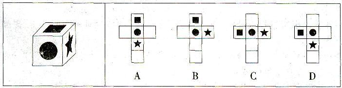 解析 利用展开后圆、矩形和五角星图案之间的排列关系解题。展开后,三个图形不可能在一条线上相连,排除A、C。D中三者的排列关系不符。