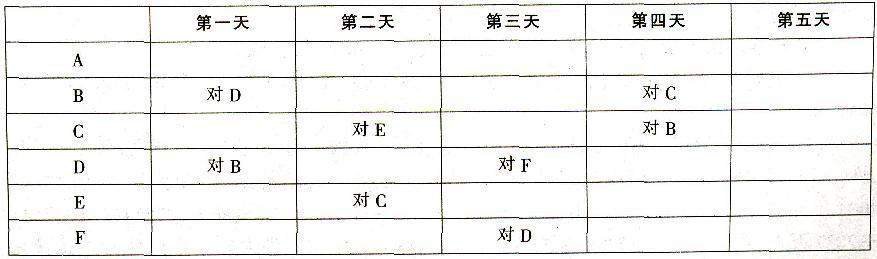 解析 分析推理类题目。运用列表法。根据题于可列表如下: 由表格可知,第二天,D不能与C.E、B、F比赛,所以第二天D对A,B对F;则第四天D不能与B.A、F、C比赛,则第四天D对E,第五天D对C;则在第四天的另一场比赛为A对F;则第五天F不可能对A、B、C、D,则F对E,A对B,选B。