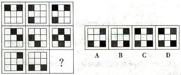 解析 每行前两个图形叠加得到第三个图形,同一个方格内的斜线与竖线叠加得到黑色阴影。